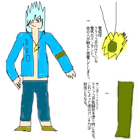 絵は旧サイトの絵を流用・・・・と、いうか今回より一気に旧サイトからの絵を流用しようと思います。 新設定画はいつかは書きます。たぶん(ぁ 名前・クラッコ 年齢・24歳 性別・男 性格・怒りっぽいが間の抜けるところがある。 CV・吉水孝宏氏【ONEPIECE(パウリー)など】 必殺技・10000万ボルト光線、雷の拳 彼は、幼い頃からとある男に「強くならないヤツは生きられない。」と言われ、 それ以来、自分が強いと言いながらよく誰かと喧嘩をしていた。 現代では更にグレていて敵とみなした者を誰だろうと倒してしまう。 デデデはそんな彼の力に感心し、入隊を願う。彼は自ら「強くなりたい!」と言い放つが、 意味もわからずいきなり改造されてしまい、雷雲の力を持つ改造人間となった。 彼は改造人間の力に好意を持ち、任務を圧倒的に成功させた。 その力は雷の力を操ることはもちろん、自らの体を雲に変形させ行動できるらしい。 しかし、時にずっこけるところもある。魔獣との共同もあるが、 足手まといの魔獣はどうでもよく敵ごと粉砕してしまう。 後にカービィと対戦するが、負けてしまったが、カービィを倒すべき者として何度も挑んだ。 以外にもしつこい男であり、負けるのが嫌いで勝つまで何度も挑むらしい。 同じ改造人間であるアイスドラゴンをいい女と思い惚れるが、実は男であったが、 それでも彼はアイスドラゴンが好きになってしまい、彼に性的な行為をした事がある。 「カービィ!!お前だけは必ず壊すぜ!!」 「俺の電気は何万ボルトだと思うんだぁ?」 「フフッ。アイスちゃん今日も可愛いねぇ~。」 「あ?誰だ、今俺に挑もうとした奴は?」 「しまった!任務に必要な物を焼いちまった・・・・。」 「へっ!貴様ごときが俺に勝てるわけねぇぜ!!」 PR ![]() ![]() |