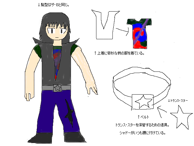 シャドーカービィを旧サイトでの絵(設定は一部だけ変えた)のまま、載せます。 カービィ・ザ・シャドー 年齢・15歳 性別・男 性格・クールだが、勝負師でもあるらしい。 CV・田中真弓氏【ONE PIECE(モンキー・D・ルフィ)など】 必殺技・ブラック・ブーメラン(カッター)、シャドーキック(ファイター)黒死芸(マジック) 平和だった鏡の世界が独裁者・ダークマインドに支配されてしまい、一部の魔術師たちが、 それを対抗すべく、現実世界のカービィ・ザ・Bをヒントにカービィを誕生させた。 それが、シャドーだった。しかし、シャドーはダークマインドの部下、 ウィズ(シャドーを造る魔術師の一人に化けた。)に暴徒システムを内臓され、 ダークマインド軍と戦うどころか、鏡の世界の住人にまで手を出してしまう。 現実世界から来たカービィたちと戦った事もあるが、時には助けてくれた事もある。 しかし、ウィズが倒され、フームに暴徒システムを取り除かれ、完全に正義を取り戻し、 カービィたちとともにダークマインドを倒した。 その後、鏡の世界を守る者として、鏡の世界にそのまま住む。 ちなみに改造される前は、鏡の世界に迷いこんだ現実世界の少年であった。 現実世界での記憶がなくなっているため、自分を誰かの影だと思った事もある。 ときどき現実世界に来る事もあり、ザ・Bたちに協力した。 強い者と戦うのが好きで、弱い者を見るのは嫌いらしい。 事件が終わり、性格や態度は変わらないが、思いやりを見せることもあるらしい。 「星のカービィは俺だけで十分!」 「貴様のような弱者が誰にも勝てると思うなよ。」 「ダークマインド!お前だけは必ず倒す!!」 「俺は・・・・お前の影だったのか・・・?」 PR ![]() ![]() |