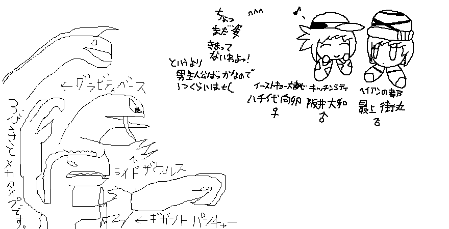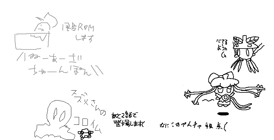 久しぶりに絵茶をしましたw 楽しかったです^^ 4枚もキャプしました。 ↑デスナイトのモンスロイドたちです。ちなみに、ギガントとグラブティをデザインを、 このネットで描くのが、これが始めてかも?( ↑スズメさん宅のコロイムをお借りしました。スライムらしい異形な姿がお気に入りだと個人的に思います^^ ↑合作で、スズメさん宅のバイナリー、ビオンド、ロト・エビソシアをお借りしました。 3人ともどれも個性的で素敵ですw ちなみに、うちのギルゾングやビバモークも描きました。 スズメさん宅オリカビ&俺宅のオリキャラをテーマにしました。 ↑合作の後、皆が色々遊んでいるそうなので、自分も描きたかったカオス・A-GOとテイトーをお借りしました。 スズメさん宅のオリカビはユニークなキャラが多くて可愛いです♪ PR ![]() ![]() |