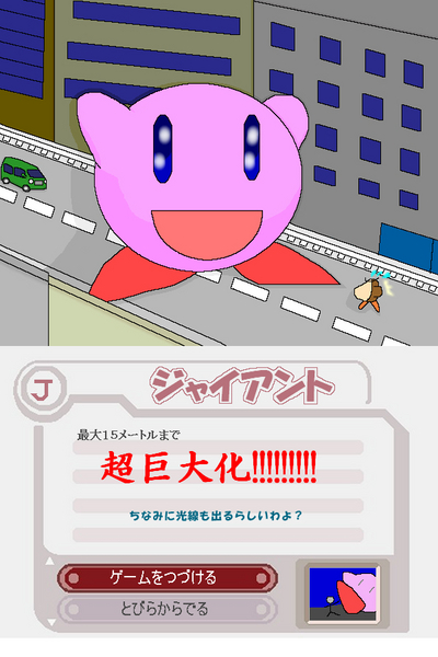 投稿した私のオリコピの絵を載せようと思います。 http://blog.cnobi.jp/v1/blog/user/2701d955efc7e455d28ef553e5c5f1c8/1258830541 ↑巨大化できるコピー、ジャイアントです。ミニマムが小さくなるなら、 大きくなるコピーだってありうるハズだと思いましてな・・・・・・^^ 本当の大きさはピクシブにあると思います。 ちなみに、私は擬人化でカービィがジャイアントコピーで怪獣や巨大星人と戦う妄想をしています。 ザ・Bの紹介ページや読み切りの魔獣大決戦の後編に詳細があるかも? PR