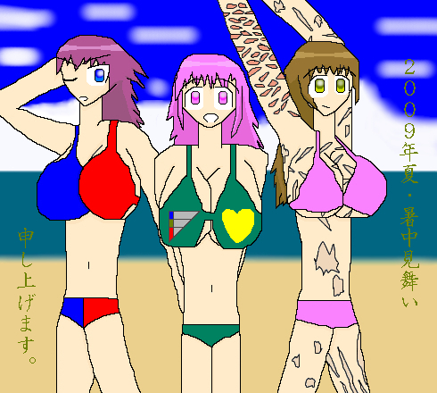 やっと描き終えました^^ 去年は擬カビでしたので、 今年はオリキャラのDGCのおにゃの子ですw こちらをどうぞ。↓ http://blog.cnobi.jp/v1/blog/user/2701d955efc7e455d28ef553e5c5f1c8/1249327268 ↑桜、野沢、清水の3人です。残念ながら、春日さんは欠席だそうです^^; どちらにせよ、皆おっぱいですし( フリー配布なので、ご自分のサイトに張っても構いません^^ 今年の夏も楽しく過ごしましょう! まぁ・・・・。私は廃人らしく生きるかも知れんが、お祭りくらいは行くかも?(ぇ サキ「ここが、日本かぁ。今になって来てみると、やっぱり、