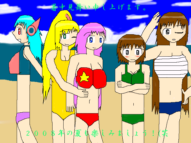 http://blog.cnobi.jp/v1/blog/user/2701d955efc7e455d28ef553e5c5f1c8/1217439568 ↑シューティ、フーム、カービィ(ヴァルキリー)、アド、チャオです。 描いてる間におっぱいハァハァしたりしました(殴 チャオだけ胸の部分だけ包帯です。まあ、チャオはそれで泳いで水での戦いの特訓をするかもね^^ そして、このイラストはもう一枚、暑中見舞い用にも描きました。 暑中見舞い用のイラスト↓ http://blog.cnobi.jp/v1/blog/user/2701d955efc7e455d28ef553e5c5f1c8/1217439538 フリー配布ですので、ご自分のサイトに張っても構いません^^ それでは、皆さん、暑い夏の中でも頑張りましょう^^ 自分はクーラーに頼ってますが(斬